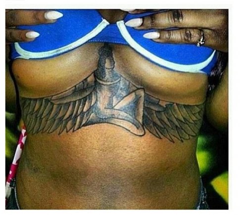 Not to long ago Rihanna took to her Instagram page to proudly display her latest tat to her NAVY. The Tattoo is of the goddess Isis and is located under her breasts. She wrote, “Goddess Isis- Complete Woman – Model for future generations- #GRANGRANDOLLY – always in and on my heart #1love.” While rihanna did it in honor of someone very close to her, she may have started a trend. One of her fans got the outstanding tat design and in the same place as Rih!