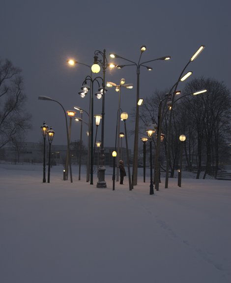 Munich, Germany-based artist Sonja Vordermaier created an installation entitled Streetlampforest, a collection of thirty European street lamps from different origins and times (Amsterdam, Berlin, Erfurt, Leipzig, Glasgow, Innsbruck, Milano, Hamburg, Prag, Cagnes-sur-mer (France), Sarajevo, Stuttgart, Belgrade, Lippstadt, Munich, Sofia, Trieste, Wolfsburg and Vienna).