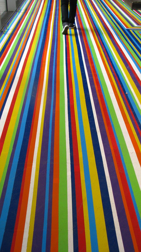 Since 1999, the Glasgow-based artist Jim Lambie (1964) has used glossy tape in varying colors to build floor installations such as Touch Zobop (2003). The vinyl tape, an everyday material applied in continuous lines, has a capacity to transform the dynamics of space, changing a quiet gallery space into an energetic and emotional space of sensory pleasure. Lambie creates a rhythm that vibrates and pulsates, and even confuses and disorients the spectator.