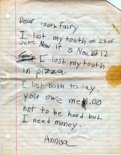 I lost my tooth on 23rd of October. Now it is Nov 12. I lost my tooth in pizza. I lost both today. You owe me $1.00. Not to be hard but I need money.