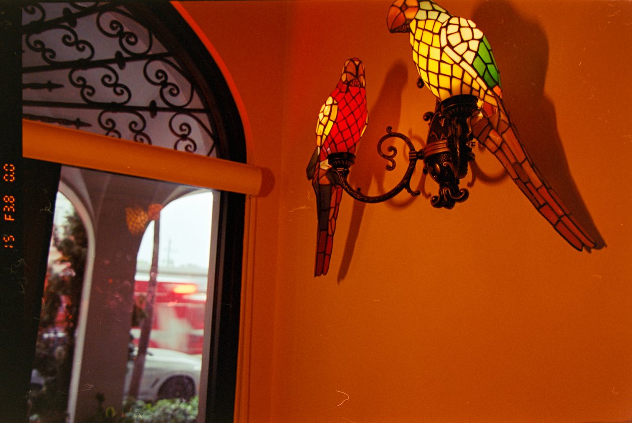 It’s not every day that you walk into a fancy-schmancy outfit that is full of parrot chandeliers. Chandeliers from the ceiling, or attached to the wall. All over the place. It was interesting. They were Tiffany lamps style or but Stain glass, or whatever its called. It was cool.