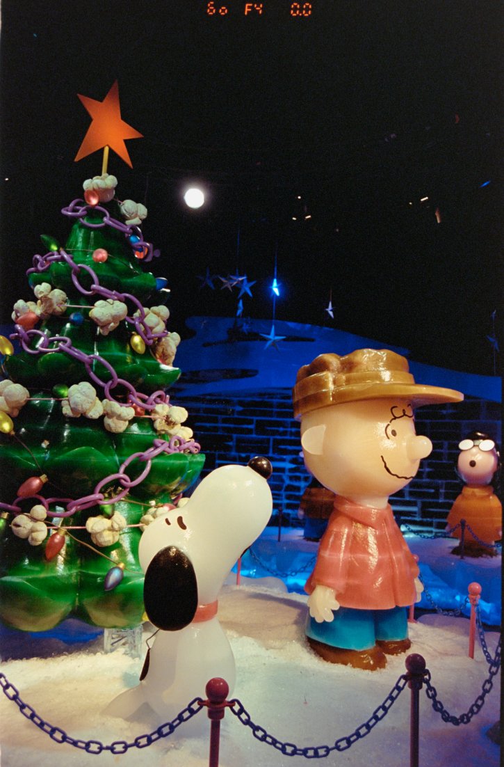Charlie Brown and Snoopy ice sculptures standing next to a Christmas tree at the Gaylord Palms event ICE! a Charlie Brown Christmas. Nikone F80s with Kodak Portra 400 film.