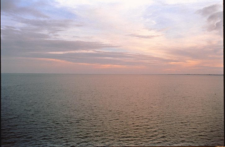 Sun setting sky and ocean with buildings in the background double exposure on Kodak 250D film.