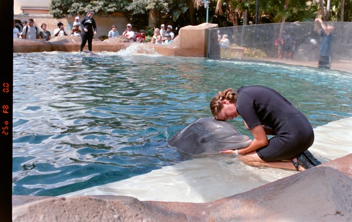 A dolphin and it's handler woman having a moment at Seaworld Orlando. Circa 2022. Nikon F80s with Fujifilm Superia X-tra 400 film.
