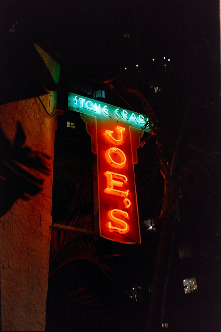 Joe's Stone Crab neon sign on Miami Beach Florida. Kodak Vision3 250D film shot with the Nikon FM2n and the Nikkor 50mm f/1.2 lens.
