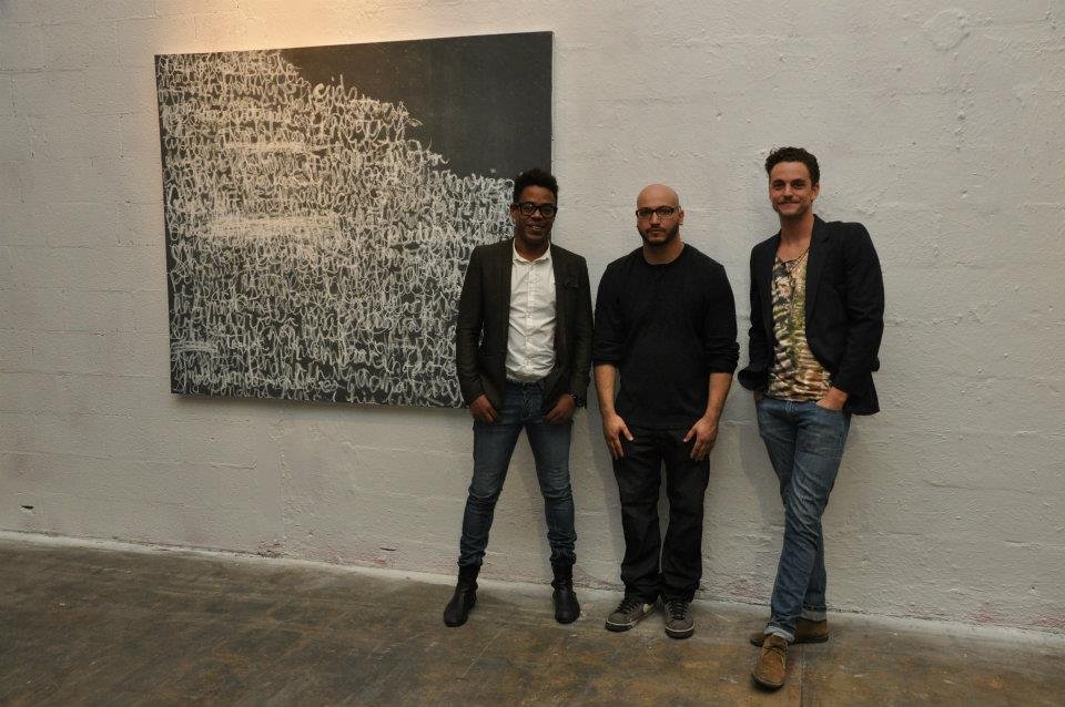 Artists: Edward Crowell II, Kiki Valdes and Johnny Laderer in beside Crowell's painting "When I Get Home" 2012