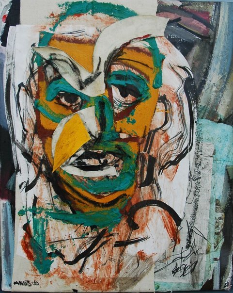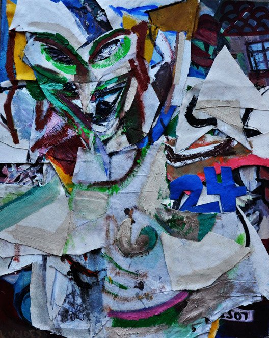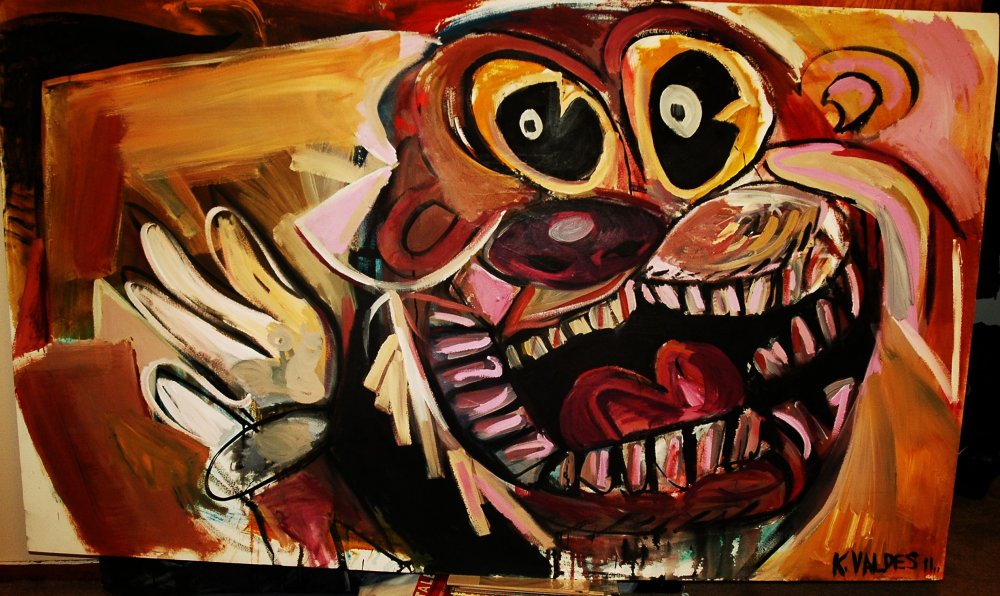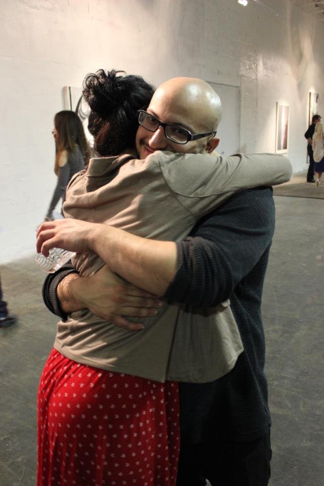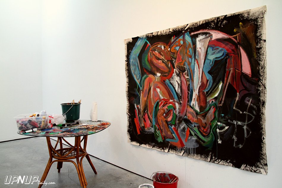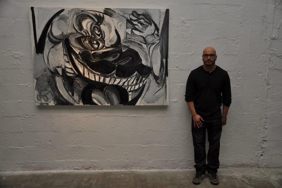 Artist and curator of THE OUTSIDERS - Kiki Valdes stands next to his painting "Face-Time" 2012