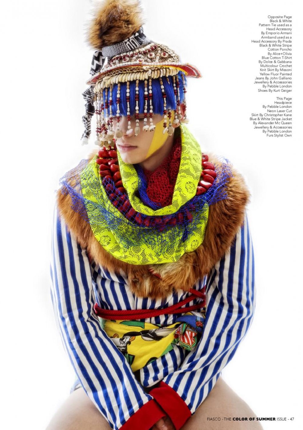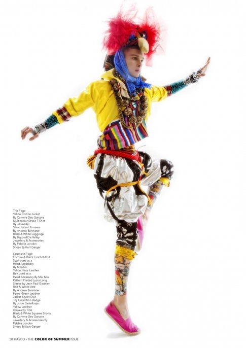 In Artur Olecki's second editorial for Fiasco's 12th issue, he wears a hodgepodge of patterns, prints, colors and textures and encapsulates the issue's theme: Colors of Summer. The expert styling was done by Max Souffraiu while the shots were taken by Iakovos Kalaistzakis.