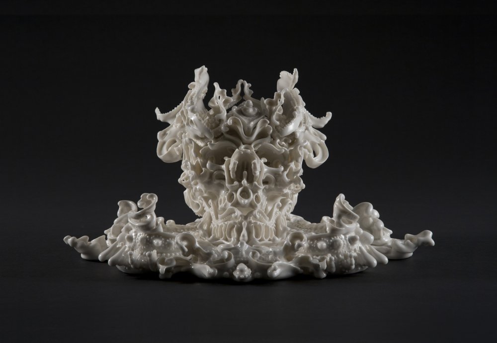 Katsuyo Aoki’s delicate porcelain works on display, including Predictive dream IX and Trolldom, combine both decorative patterns and paints of blue and purple baked on parts of the white porcelain, creating a smeared-like appearance. Presented in an entirely stark white room, the sculptural pieces which bear a mixture of traditional ornamentation decorum of symmetry together with fantastical depictions of other-worldly creatures and skulls, draw viewers into an enclosure befitting a religious and mythical experience. Aoki creates these works based on what she terms her “inner shadow” of imagination and fantasies, and strives to convey both a sense of strength and fragility to parallel the nature of human societies anchored on the advance of technology and progress, while remaining fractious and imperfect.