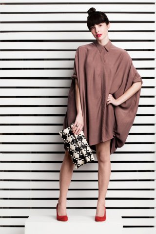 CAREY dress: shown in rose sand silk with butler woven clutch and Kat pumps in red kid suede.