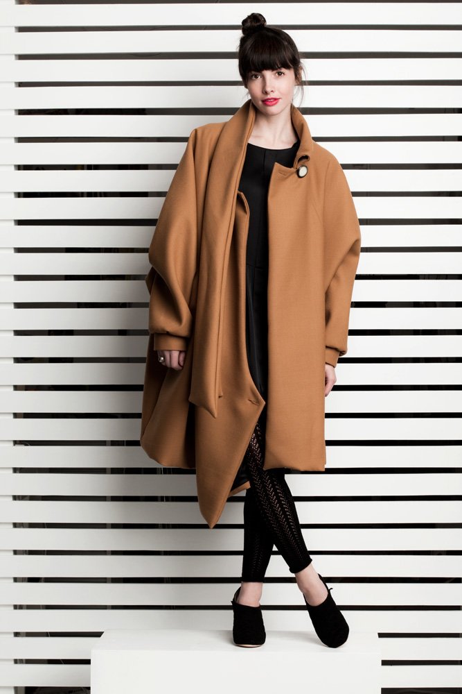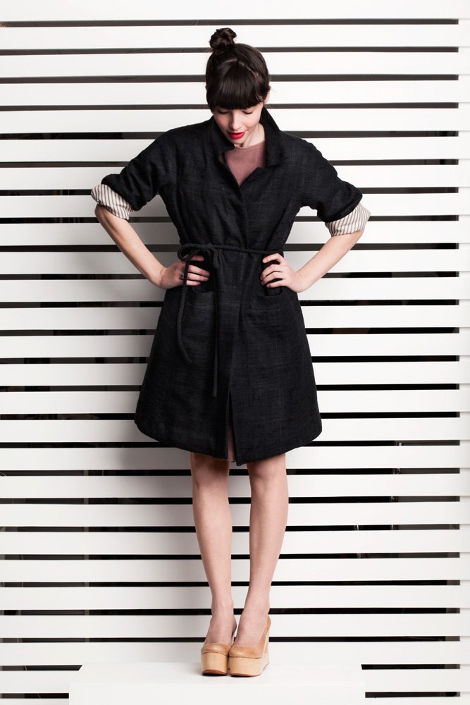 PARKER coat: shown in black raw silk with cotton ticking-stripe lining and Kat wooden wedges in caramel leather.