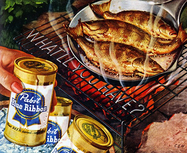 Classic! Vintage Pabst Blue Ribbon advertisement. As the slogan goes "What'll you have?" Yes yes. I want some fish with my Pabst thank you very much.
