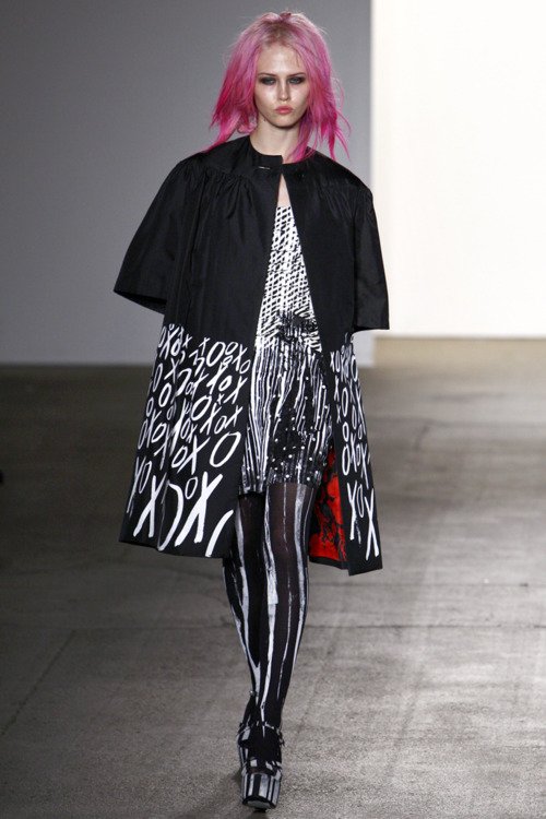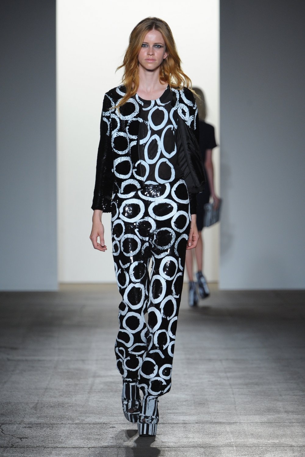 white, black, and a few other colours to design a collection owned by graphic prints: stripes, circles, graphs, flowers, and words combine together freely even on accessories. Many are also overlapped so that the layers of different fabrics, at times embellished by shimmery sequin appliqués, create the silhouette. Silk outfits, woolen cloth coats, and organza and tulle volumes attract attention thanks to their bold graphic designs and intense contemporariness