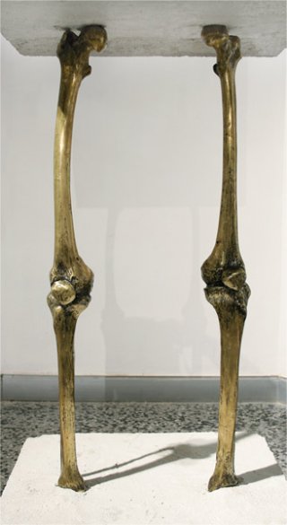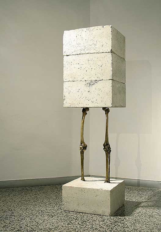 The artist did molds of real bones with provenance from different dead people and after reproduced in wax each one, adjusting them and creating the representation of a new subject in that sculpture. The weight of the concrete is used like a symbolic element. Equilibrium is as a metaphor of struggle and resistance. Gravity reminds the spiritual weight that everyone supports and talks about fragility of our own life.