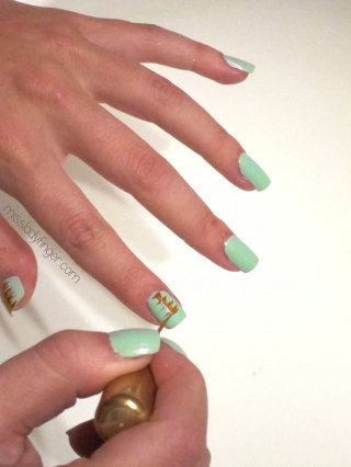 Use a thin nail art brush (can be found at your local beauty supply store) to apply a brown-gold polish in a zig zag motion horizontally along the center of the nail. This area does not have to be perfect; the point is for there to be uneven, flowing lines.