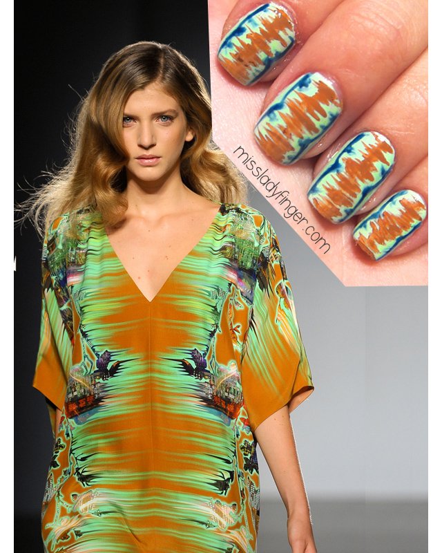 We spoke with Miss Ladyfinger herself, Taryn Multack, and she'll be creating nail designs just for us in the coming weeks. Her first, based off of Matthew Williamson's SS 2012 show, blends teals and browns seamlessly together.