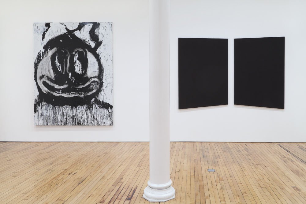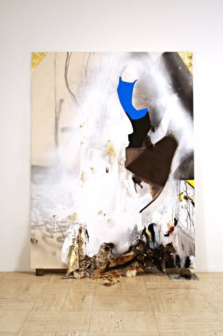 Wilhelm Sasnal, Thilo Heinzmann, and Eberhard Havekost all engage the inherent tensions between masking and revealing form as subject. Heinzman’s Heinze appropriates the naked form of the classic haystack armature as a standing sculpture, its spiked arms recalling the inherent dangers of support systems. Sasnal’s painting of strobe lights characteristically withholds in his search for a meaningful subject to paint. The surface of Havekost’s Minus 2 Meter 2, is unheimlich in its luxuriant depiction of a folded blanket that is also a veiled and masked surface.