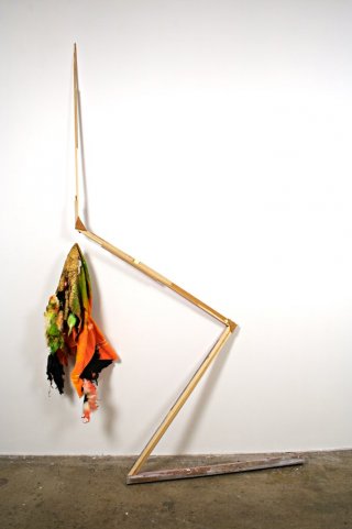 Untitled (Medusa and Cassiopeia commune), 116" x 30" x 3", scrap wood, spray paint, kool aid, lambs wool, and rubber, 2008