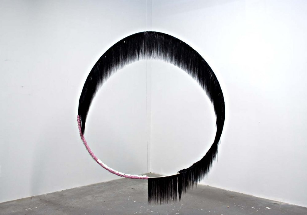 Extension/Ascension, 55 x 65 x 2", human hair, gold, terry cloth, clay, staples, and wood, 2010