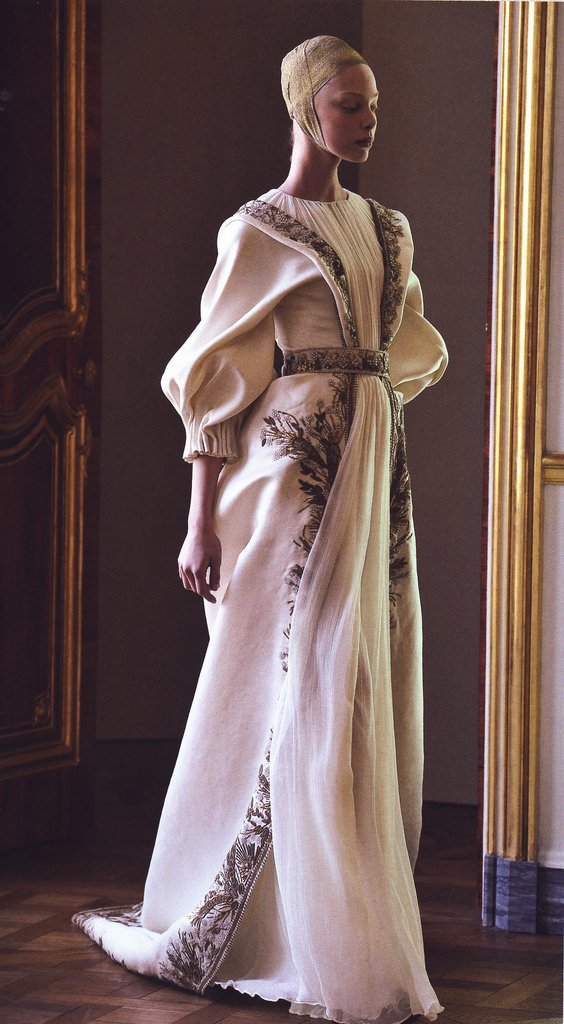 This look, simplistic in cut, yet exquisite in silver-embroidered detail, radiates the ethereal beauty of an angel as depicted in traditional Catholic imagery. The model's head is bound with bandages, a move which at once references McQueen's legendary Spring/Summer 2001 Asylum collection whilst also nodding towards the head coverings donned by modest women in Northern European medieval and Renaissance portraiture, such as Johannes Vermeer's 1665 masterpiece, Girl with a Pearl Earring.