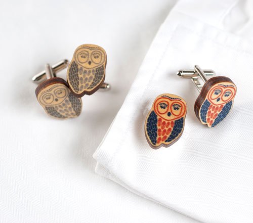 These cufflinks feature two little owls with red and blue feather details. Made from sustainable plantation hoop pine ply. 16x23mm