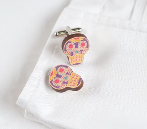 These skulls celebrate the 'Day of the Dead' in Mexico, and are adorned with marigolds, hearts and petals. The colourful printing brings the coordinating pair to 'life'. Made from sustainable plantation hoop pine ply. 17x21mm