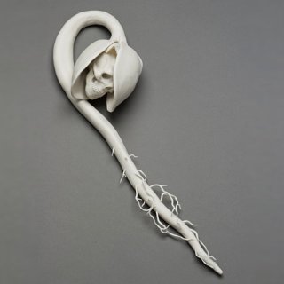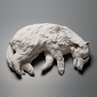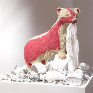 "In my work this romantic ideal of union with the natural world conflicts with our contemporary impact on the environment.  These pieces are in part responses to environmental stressors including climate change, toxic pollution, and gm crops.  They also borrow from myth, art history, figures of speech and other cultural touchstones.  In some pieces aspects of the human figure stand-in for ourselves and act out sometimes harrowing, sometimes humorous transformations which illustrate our current relationship with the natural world.  In others, animals take on anthropomorphic qualities when they are given safety equipment to attempt to protect them from man-made environmental threats.  In each case the union between man and nature is shown to be one of friction and discomfort with the disturbing implication that we too are vulnerable to being victimized by our destructive practices."