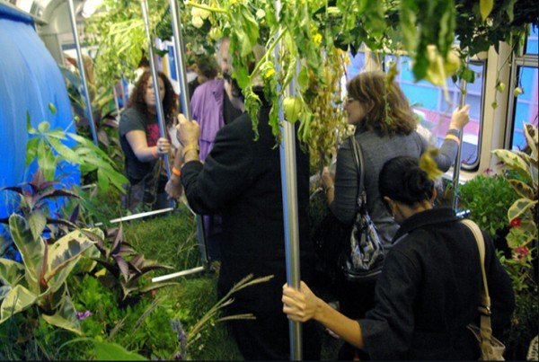 Most recently, Chicago’s Art on Track festival transformed a subway train into a movable art gallery of multiple installations by over 50 artists, from thematic rooms to choreographed performance pieces. The standout project, the Mobile Garden Car by noisivelvet, covered one of the train car with a thick carpet of greenery, including plants and sod donated by local . The moving greenscape looped around Chicago’s downtown for 5 hours, inviting commuters to sit on seats lined with bushy lawngrass and potted plants or stand amid tall grass and hanging ivy.