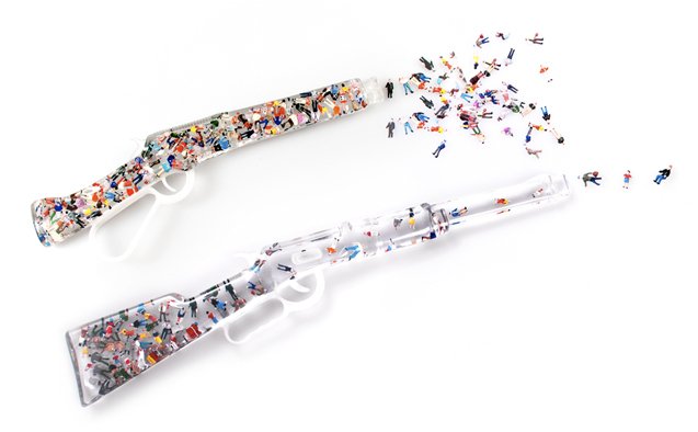 GUNS (2009). Sculpture, resin and found objects, 15x79x60cm.   No human hands pull the trigger. The gun/mob appears to take on a life of its own. Guns induces a sense of sadness and helplessness. Limp, wasted, lifeless miniature people suggest the impotence of war. The work impacts by using visual ambiguity. The multitude of colours implies playfulness, only to induce, on closer scrutiny, confusion and doubt.