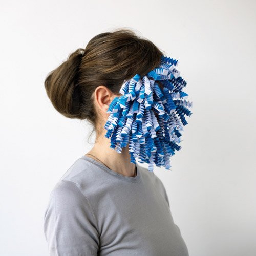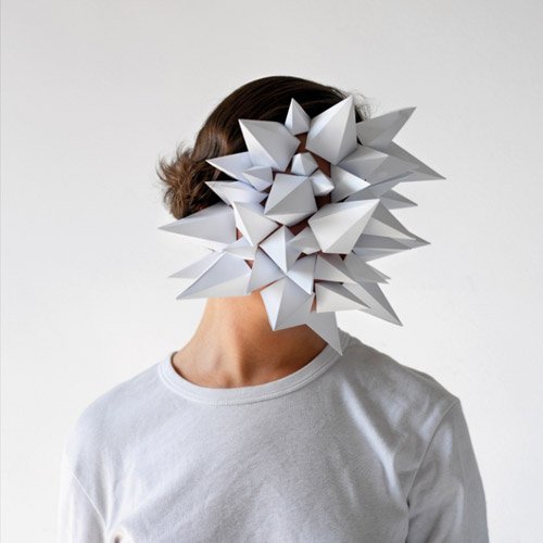 The photographs were used in a catalog for the company showcasing the unique qualities of the company’s products. Each work features a model with a mask of head piece made entirely form paper that has been bent folded and cut in unique ways.