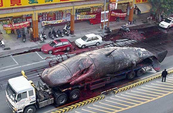 A 56-foot, 60-ton sperm whale died on a beach in Taiwan in January, 2004. Researchers wanted the carcass to perform an autopsy and for research, so they loaded the whale onto a tractor-trailer and set out through the city of Tainan, heading for the Shi-Tsau Natural Preserve. It took 13 hours, three cranes and 50 workers to get the whale loaded on the truck.
