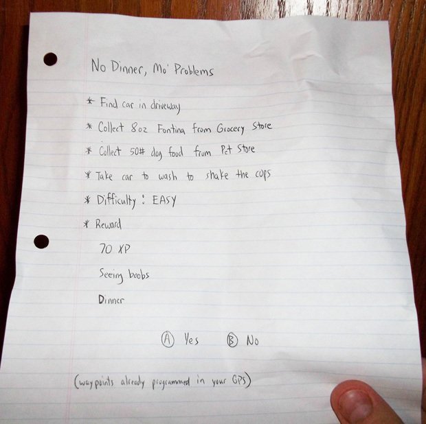 Posted by Redditor ElMangosto, the chores are from his girlfriend and written out like a GTA-style mission called "No Dinner, Mo' Problems." The list has things like, "Collect 8oz Fontina from grocery store" and "Take car to wash to shake the cops." We salute this woman for her hilarious spin on a typical to-do list. Talk about creative communication.