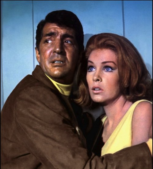 Somebody should have told DEAN MARTIN (Dino Paul Crocetti, 1917-95) that his canary-yellow turtleneck in the Matt Helm movies didn’t flatter a face tanned like saddle leather. Martin was already an established Hollywood and Vegas property when he made The Silencers (1966), first of four campy perversions of Donald Hamilton’s tough, witty spy novels, and subsequent influence on everything from Mel Brooks’s “Get Smart” series to Mike Myers’s Austin Powers franchise. The opening sequence has Helm sliding from a tilting circular bed into a vast bubble bath with his ‘secretary’ Lovey Kravezit then emerging to be buffed with power towels and fitted with silk kimonos dropped from above — the bachelor-pad equivalent of overcomplicated battle-prep assembly lines in Gerry Anderson’s Thunderbirds Are GO (also 1966) or Nick Park’s The Wrong Trousers (1993). The Helm movies are tedious babe-parades loosely draped over supervillian-in-underground-lair-bent-on-global-domination plots, but they mark an important shift in Dino’s long and unstoppable career: from cherished if slightly goofy crooner-comedian of the Martin-Lewis and Rat Pack heydays, to dinner-jacketed hunk of boiled meat. Hosting the Dean Martin celebrity roasts of the 1970s, laboured televisusal festspielen that skewered a gallery of hilo notables ranging from Barry Goldwater and Ralph Nader to Truman Capote and Evel Knievel, Martin reached his nadir. Always in the middle seat, making with the conspicuous guffaw, highball and cigarette reliably in hand, there was tan-tan Dino, cocoa-butter shell of a man. Kick in the head is right.