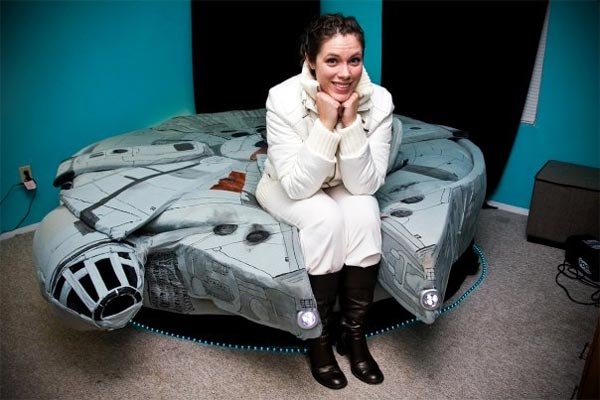 Designed by Kayla Kromer the Millennium Falcon Bed is a Star Wars geek dream come true. I mean, look at it, it is a bed shaped like the Millennium Falcon from Star Wars. And there is a lady dressed as Princess Leia, for crying out loud. The only thing that would make this dream better is if she was wearing the metal bikini outfit from Jabba’s Palace in Return of the Jedi.  Apart from the incredible design, the Millennium Falcon Bed features working headlights, hidden compartments for your every day needs, starfield projection and even cockpit space for you favorite Star-Wars action figures. I’m pretty sure that every Star Wars fan would love to sleep on this bed. Would you love to sleep on it ? Pictures by Heather Leah Kennedy.
