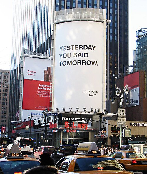 Rarely do you walk down the street and see an ad that can actually inspires, instead of the typical billboard ads trying to brainwash you. This is actually pretty great and makes you think about your life and things you need to get done. Job well done Nike.