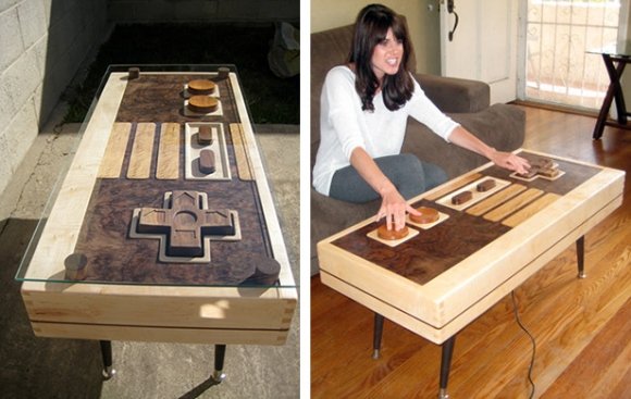Furniture and instrument builder Charles Lushear (Venice, CA) built a beautiful and fully functionalNES Controller Coffee Table out of wood. He used the natural hues of mahogany, maple, and walnut wood in place of the original black, gray and red motif. Does someone have too much time on their hands? You be the judge. ;-)