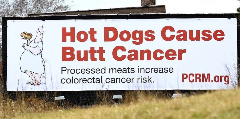 Hot Dogs Cause Butt Cancer: Processed meats increase colorectal cancer risk. The billboard, timed to coincide with the April 4 home opener of the 2012 baseball season in Miami, features a cartoon drawing of a man in a hospital gown, hot dog in one hand, perplexed eyes fixed on his protruding behind. It is located at 600 N.W. 57th Ave.