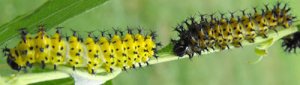 Cecropia caterpillars right after they hatch are black. As they go on and molt a few times, they grow in size and eventually change colors to green. Then, when they are ready, they spin their cocoon and begin the cycle again.