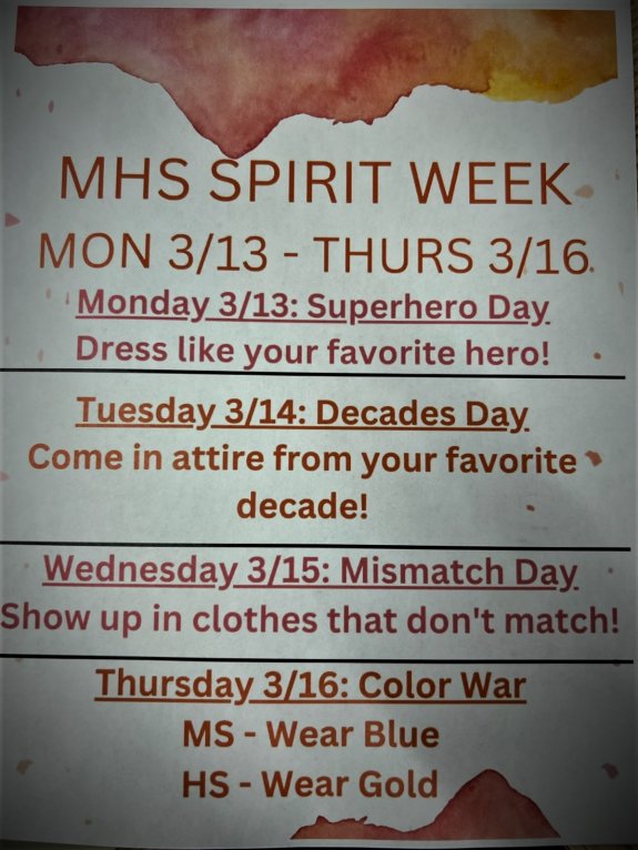 Blue/Gold Day- Show off your school spirit by wearing Blue and gold. If you purchased a Bulldog Week t-shirt then wear it proudly.
