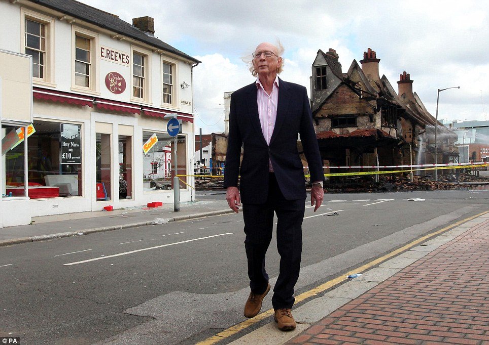 Heartbroken: Reeves furniture store owner Maurice Reeves arrives today at the store's ruined 140-year-old building in Croydon