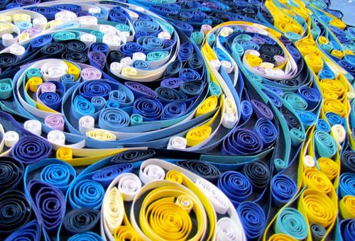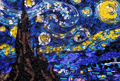 Here's a version of Van Gogh's "Starry Night" created using thousands of curled up strips of paper. Susan Myers used a process called paper quilling to painstakingly build up her version of the piece. Pretty amazing outcome.