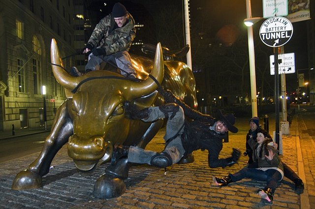 Bull Hunting on Wall Street in the New York City Financial Distrcit with Eric Pye as bystanders take cover.