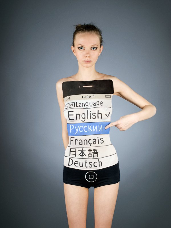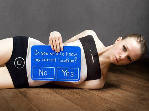 Female painted as the iphone. Now, why couldn't I think of that? I wonder how you put in the battery? Check out the other photos at Design You Trust.