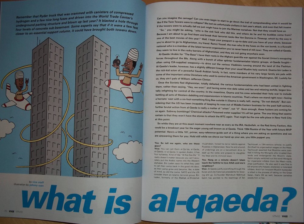 1994 article of Vice Magazine,  where Beavis and Butthead are shown as Al Qaeda about to fly planes into the towers. You have to admit this is sort of creepy. Illustration is by Johnny Ryan.