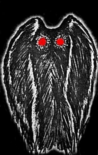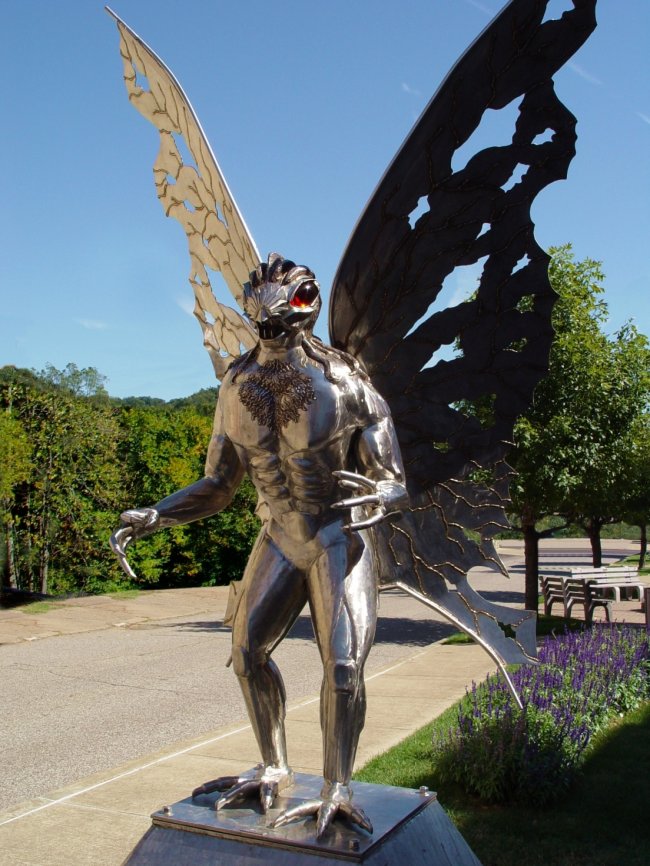 The first sighting came in the early 1960s. A woman was driving along Route 2, near the Ohio River, with her father. As she neared the Chief Cornstalk Hunting Grounds, a large man-shaped figure walked out onto the road. As the woman slowed her car, the figure spread two large wings and took off. Ironically, the witness did not report the incident - "Who would believe us, anyway?"