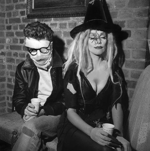 Maila Nurmi dressed as a sexy witch version of Vampira in 1956. After taking the year before off and mourning, this was the first Halloween she actively celebrated after the death of her close friend James Dean. With her is another long time friend Jack Simmons, dressed in a costume of questionable taste… James Dean as carwreck survivor still undergoing plastic surgery.