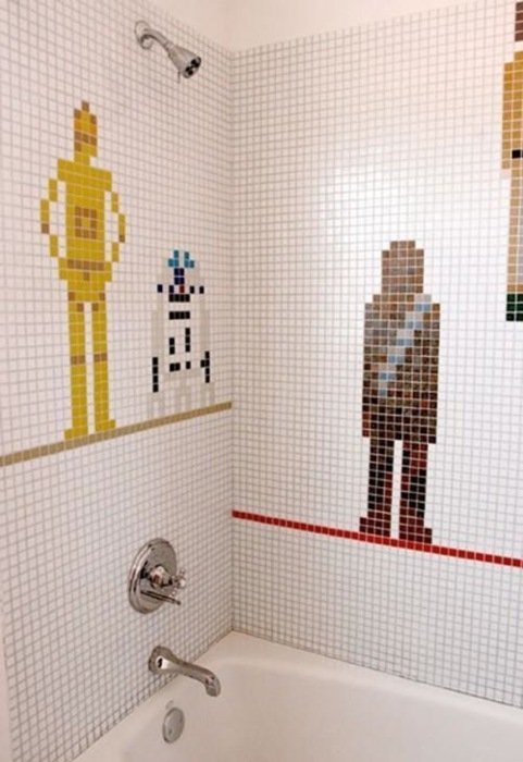 This mosaic style bathroom is the cherry on top for anyone obsessed with anything Star Wars. All that is missing are some Dark Side themed towels.
